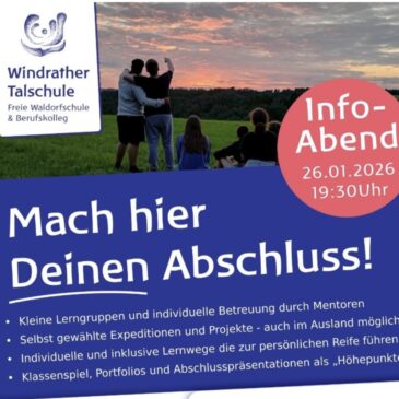Infoabend Berufskolleg Unser Berufskolleg für Sozial- und Gesundheitswesen der Windrather Talschule lädt am Montag 26.01.2026 um 19:30 Uhr zu einem Informationsabend ein. In den Räumen der Schule an der Panner Straße 24 wird unser Bildungsgang Sozial- und Gesundheitswesen vorgestellt, der in unsere differenziert und individuell arbeitende Oberstufe – genannt „Talkolleg“ – integriert ist. Der zweijährige Bildungsgang des Berufskollegs steht allen Schülerinnen und Schülern mit Fachoberschulreife offen – eine gymnasiale Qualifikation ist hierfür nicht von Nöten. Eine Besonderheit ist, dass im … Weiterlesen